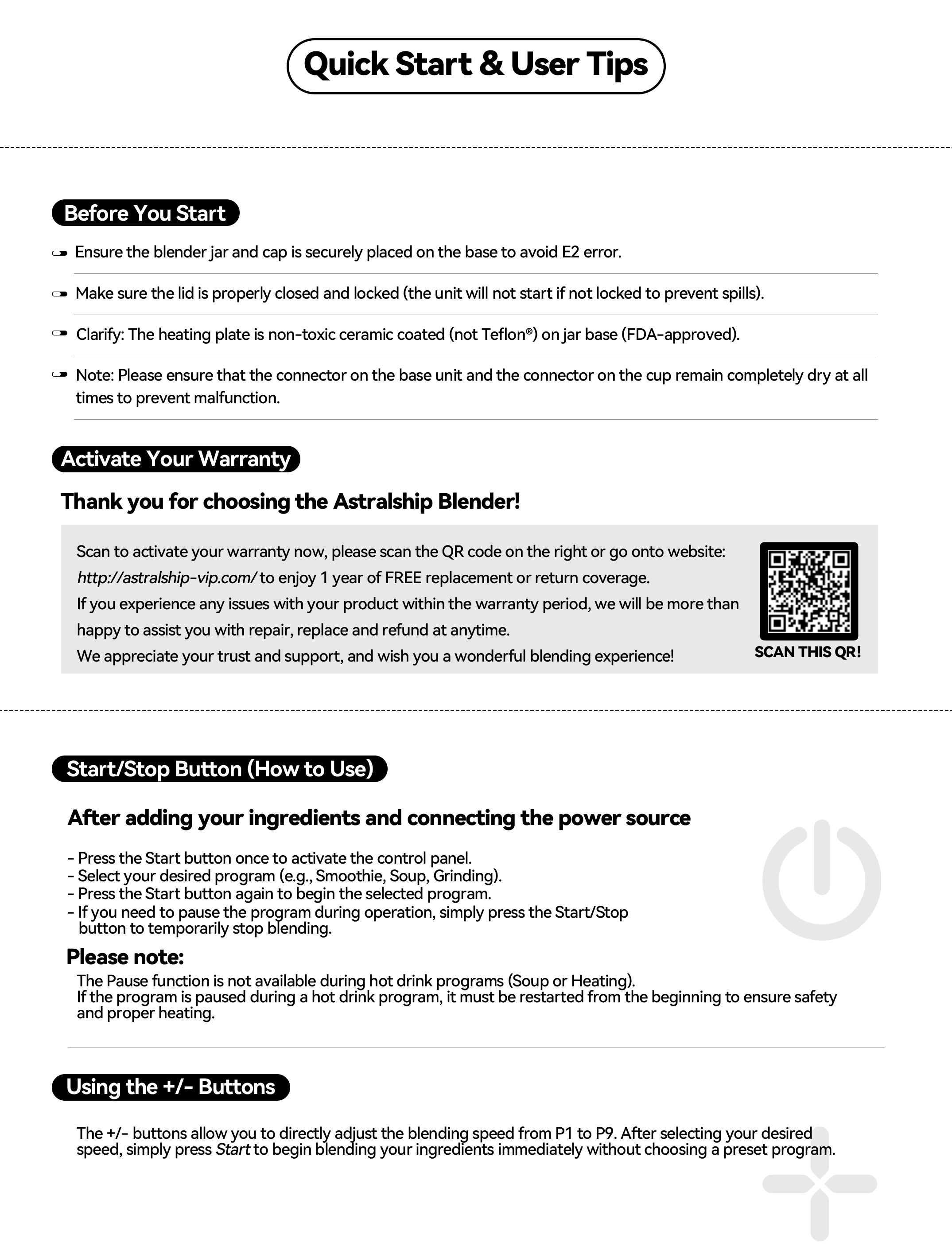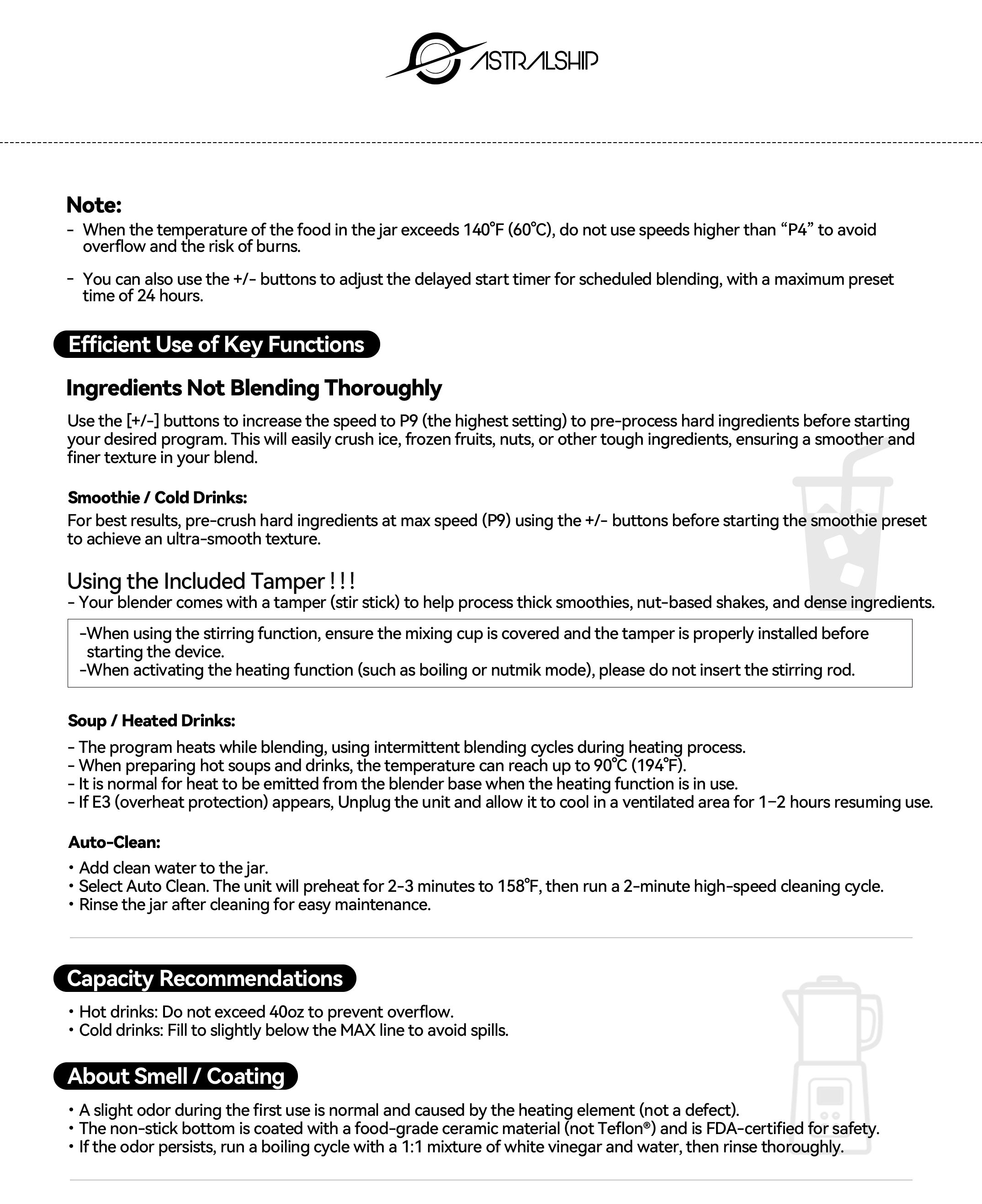 Download the complete user manual for your ASTRALSHIP ASH01-B PRO high-speed blender. Inside you’ll find safety guidelines, setup steps, preset program instructions, cleaning tips, and troubleshooting so you can get the best performance from your blender every day.