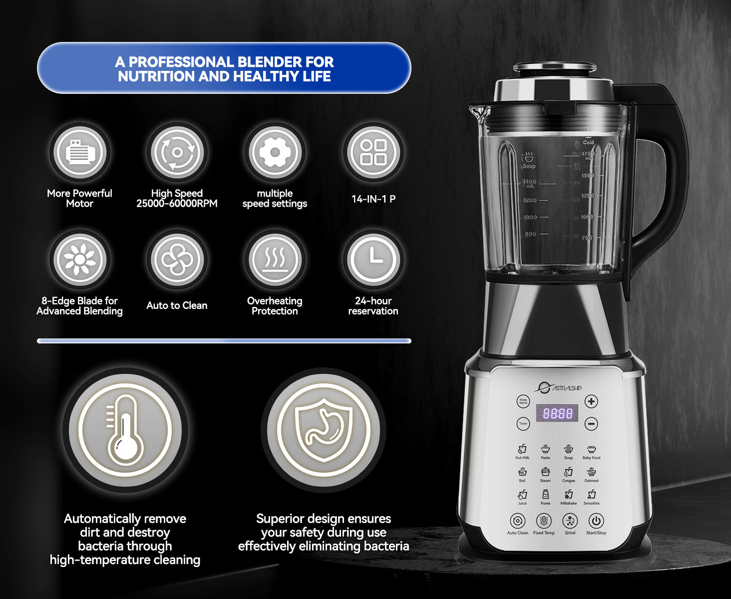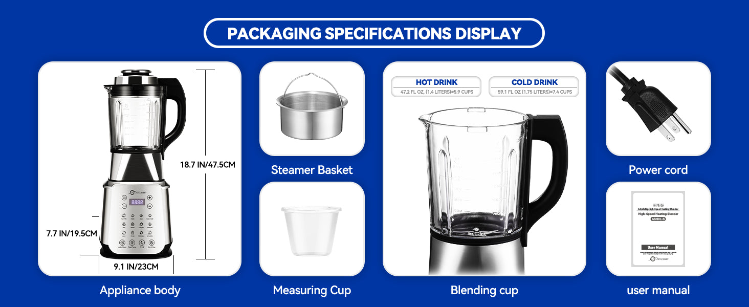 - Heating & Keep-Warm Function – Designed for Comfort – Enjoy soups, nut milks, and warm drinks anytime. The double-layer heat-resistant glass jar blender ensures safety, while the built-in heating element keeps your beverage warm (86–194°F/ 30-90°C). This licuadora combines power, so your family can enjoy a hot drink even if they arrive home late.