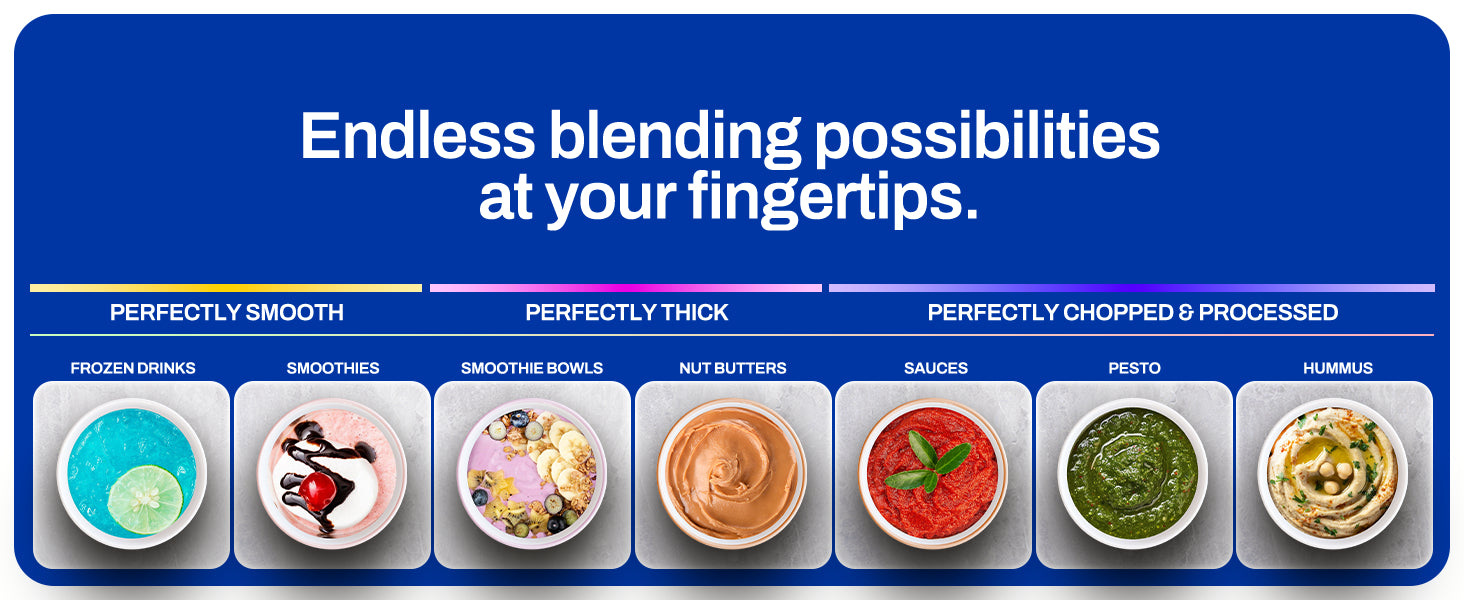 | Recommended Uses For Product | Mixing, Whisking, Whipping, Blending, Crushing, Chopping, Ice Crush, Juices, Creams, Pureeing, Grinding |